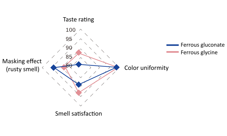 Zat besi cair liposom memiliki kinerja yang sangat baik dalam hal rasa (82/88 poin), keseragaman warna (99,5%), kepuasan bau (≥89%), dan efek penutupan rasa (≥88%), mencapai terobosan sensorik dalam suplemen zat besi.