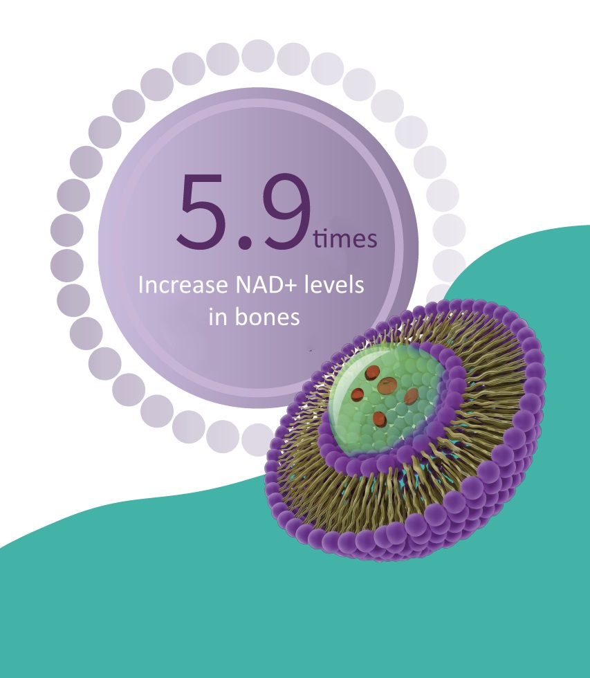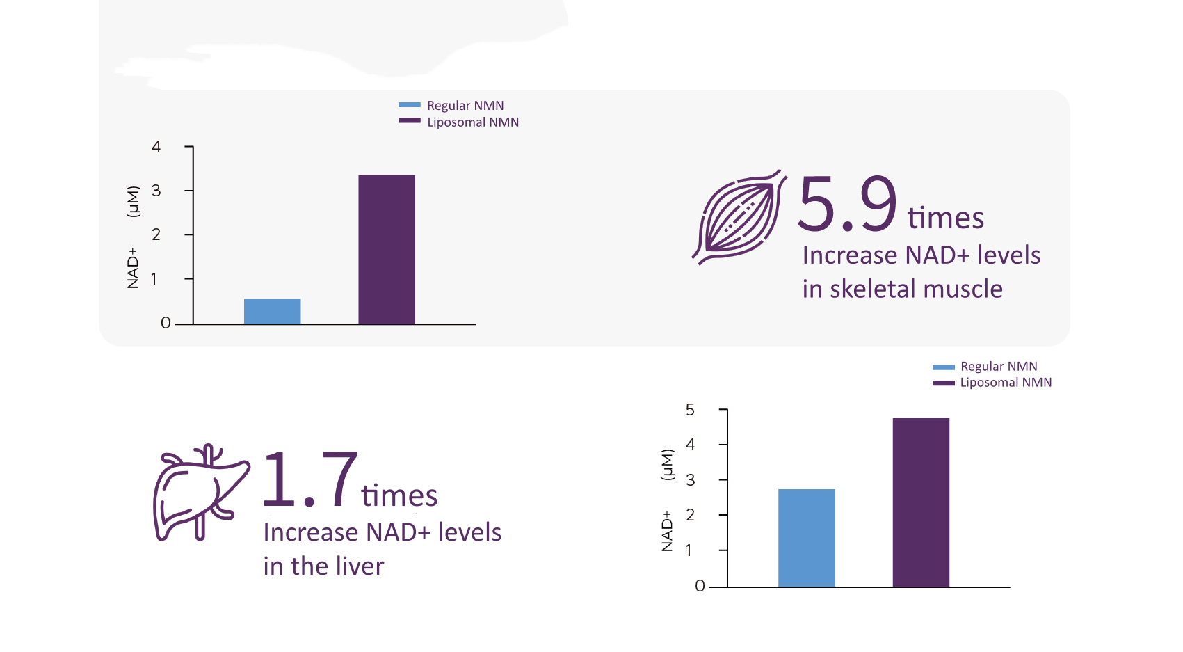 Dibandingkan dengan NAD+, NMN liposomal meningkatkan kadar NAD+ di otot rangka sebanyak 5,9 kali.
