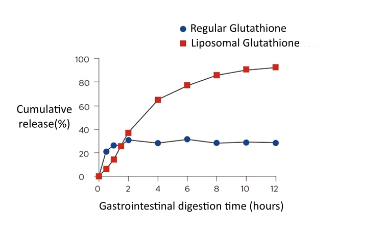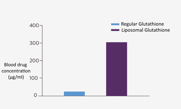 Ketersediaan hayati glutation liposomal hingga sekitar 13 kali lipat lebih tinggi daripada obat aslinya. Glutation liposomal mencapai konsentrasi puncak (Cmax) yang lebih tinggi di dalam tubuh dan bertahan jauh lebih lama daripada obat aslinya.